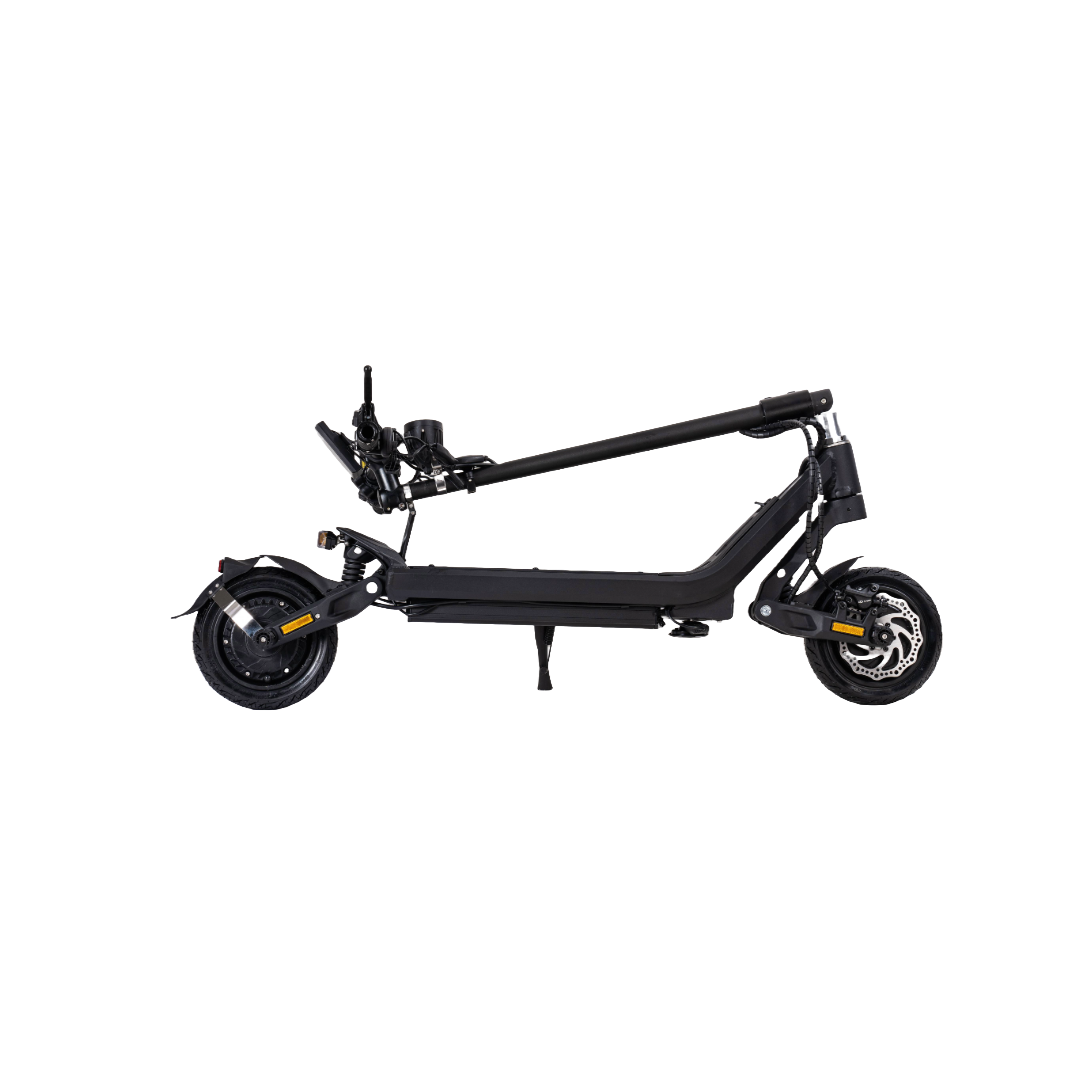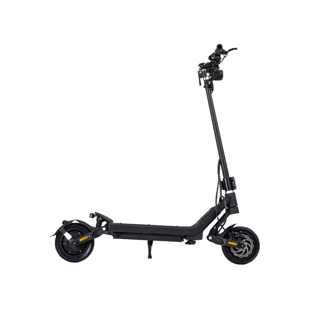 Grâce à sa suspension à ressorts et ses pneus tubeless 9 pouces, elle absorbe efficacement les irrégularités de la route. La conduite reste fluide et confortable, même sur terrains difficiles.